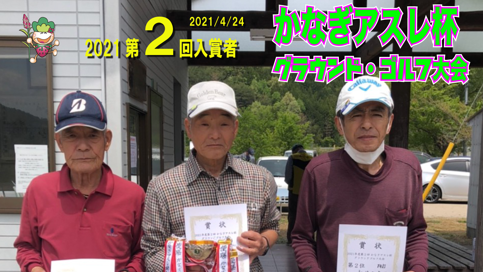 2021 第2回かなぎアスレ杯 結果 お知らせ 2021.04.24 1位:山下 嘉雄 74打 2位:永井 弘志 74打 3位:伊藤 岩夫 76打 4位:山藤 照恵 80打 5位:河崎 繁人 80打 参加者42名